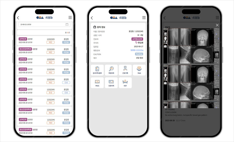 원내/외에서 환자 정보, 진료/검사 정보를 모바일 디바이스를 통해 손쉽게 확인, 주요 상황에 빠르게 대처하고, 원활한 진료 프로세스를 지원하는 모바일 솔루션