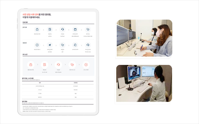 원격지의 환자가 의료기관을 직접 방문하지 않고, 화상 솔루션을 통해 비대면 사전 상담 및 현지 의료진과 협진을 진행하는 원격 상담/협진 시스템