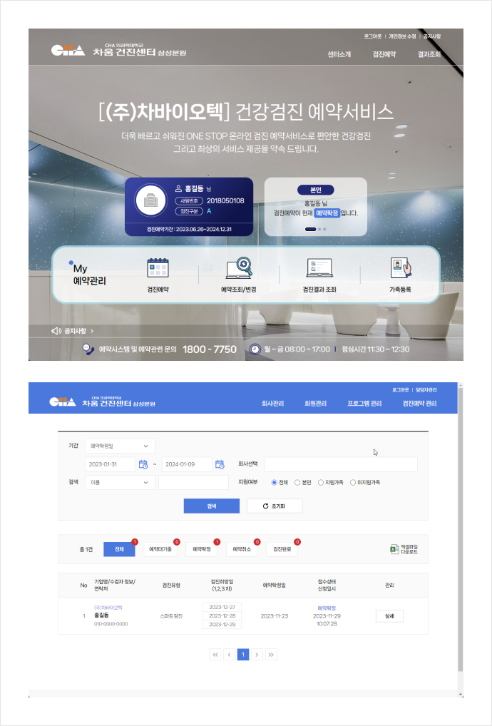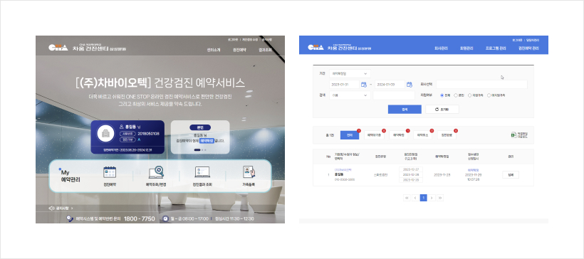 고객 등록부터 예약, 검진상품 관리, 검진 결과 조회까지 기업 건강검진 관리를 위한 원스톱 서비스 제공