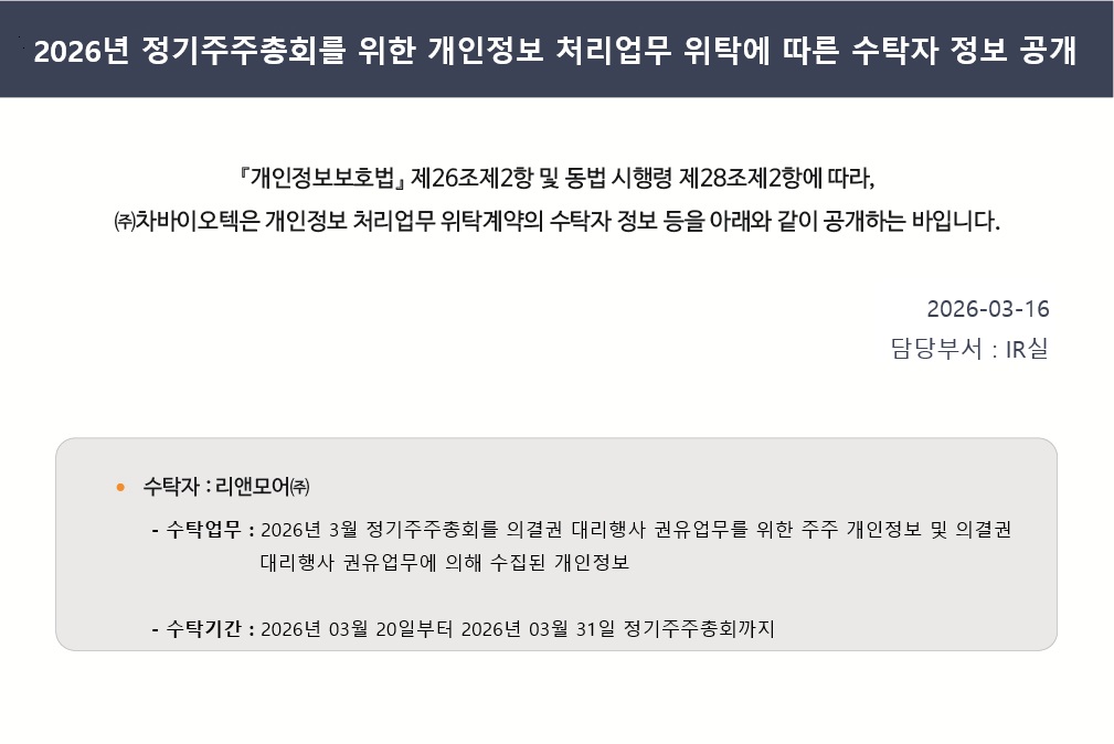 [차바이오텍] 2026년 정기주주총회를 위한 개인정보 처리업무 위탁에 따른 수탁자 정보 공개